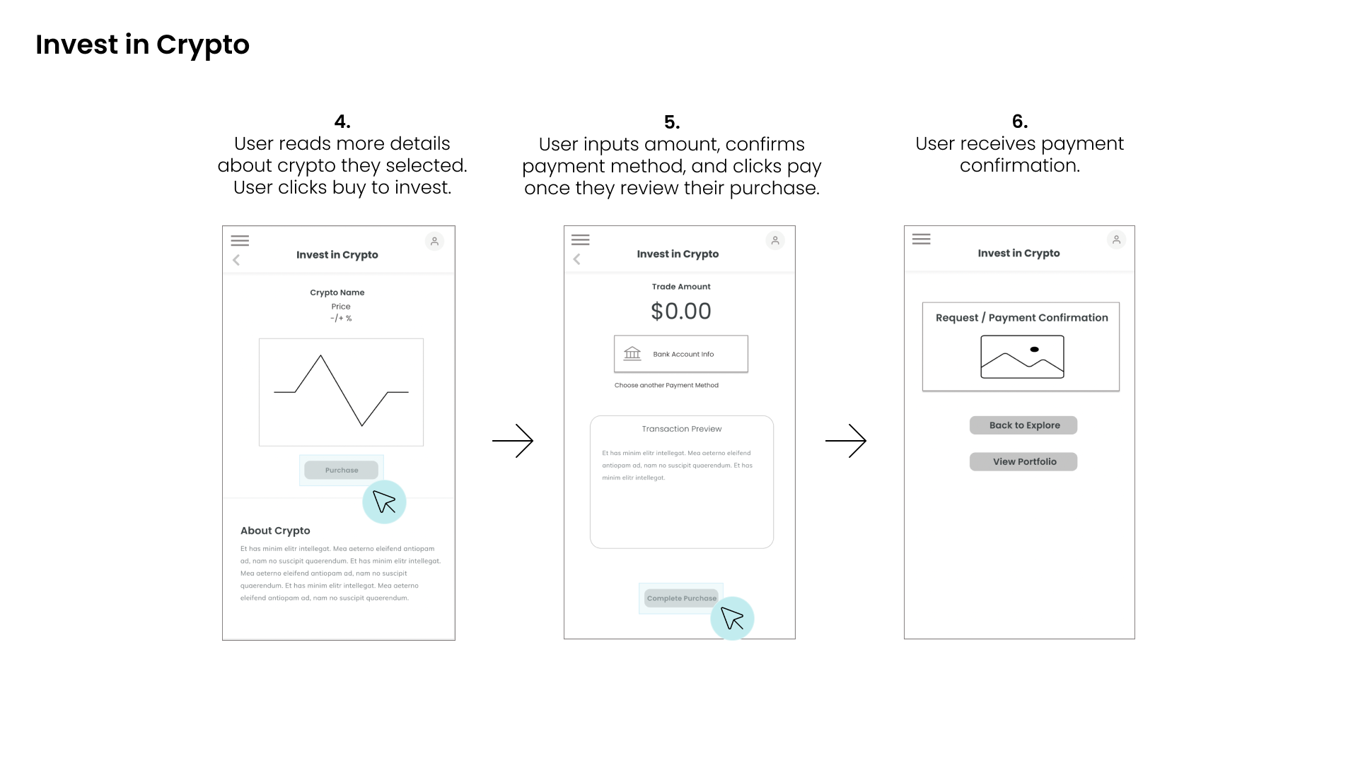 I began sketching out my ideas using paper/pen for 3 core app functions: Payment & request, Invest in Crypto, View Account Statements.